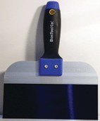 This line of taping knives from Bon Tool Co. is ergonomically designed and finished with a comfort grip handle for the best comfort available to drywall finishers. The soft grip on the handle provides a comfortable touch and less fatigue for finishers. The blade of this finishing tool is fully hardened to the proper flex available in high carbon blue steel or stainless steel. The knife is constructed with a one piece, non-rusting aluminum back securely fastened to the blade and handle. The blade is available in 4 sizes at 3" wide by 8-, 10-, 12- or 14-inch long.